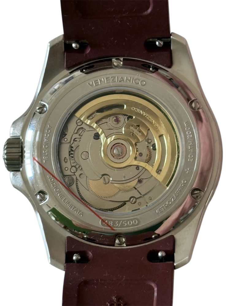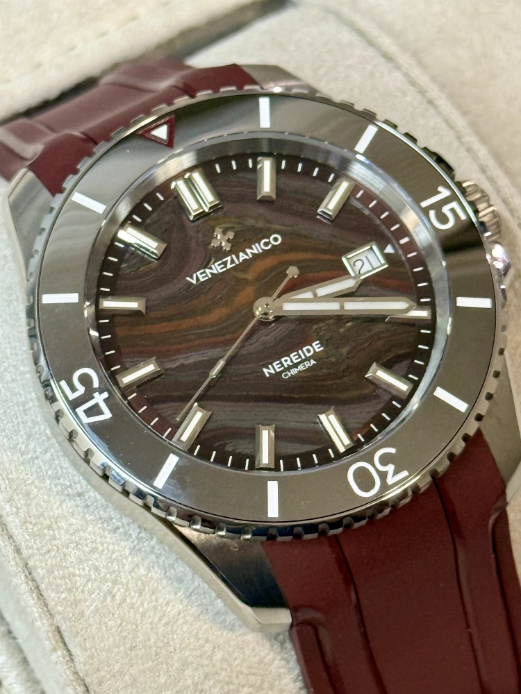 Venezianico Nereide Chimera – Edição Especial Limitada e Numerada O Venezianico Nereide Chimera é uma peça que se destaca imediatamente pela sua proposta única. Seu grande diferencial está no mostrador em pedra natural, resultado da fusão de três minerais distintos — olho de tigre, jaspe vermelho e hematita — que possuem estruturas e comportamentos diferentes. Essa combinação cria uma superfície orgânica e imprevisível, onde tons de vermelho intenso, veios escuros e reflexos metálicos se distribuem de forma exclusiva. Como consequência, cada mostrador é único, tornando cada relógio uma peça singular. O nome Chimera vem justamente dessa união de elementos heterogêneos, que juntos formam algo completamente novo e irrepetível. Além do apelo visual, o modelo mantém a robustez característica da linha Nereide, com construção sólida e especificações confiáveis para uso diário.